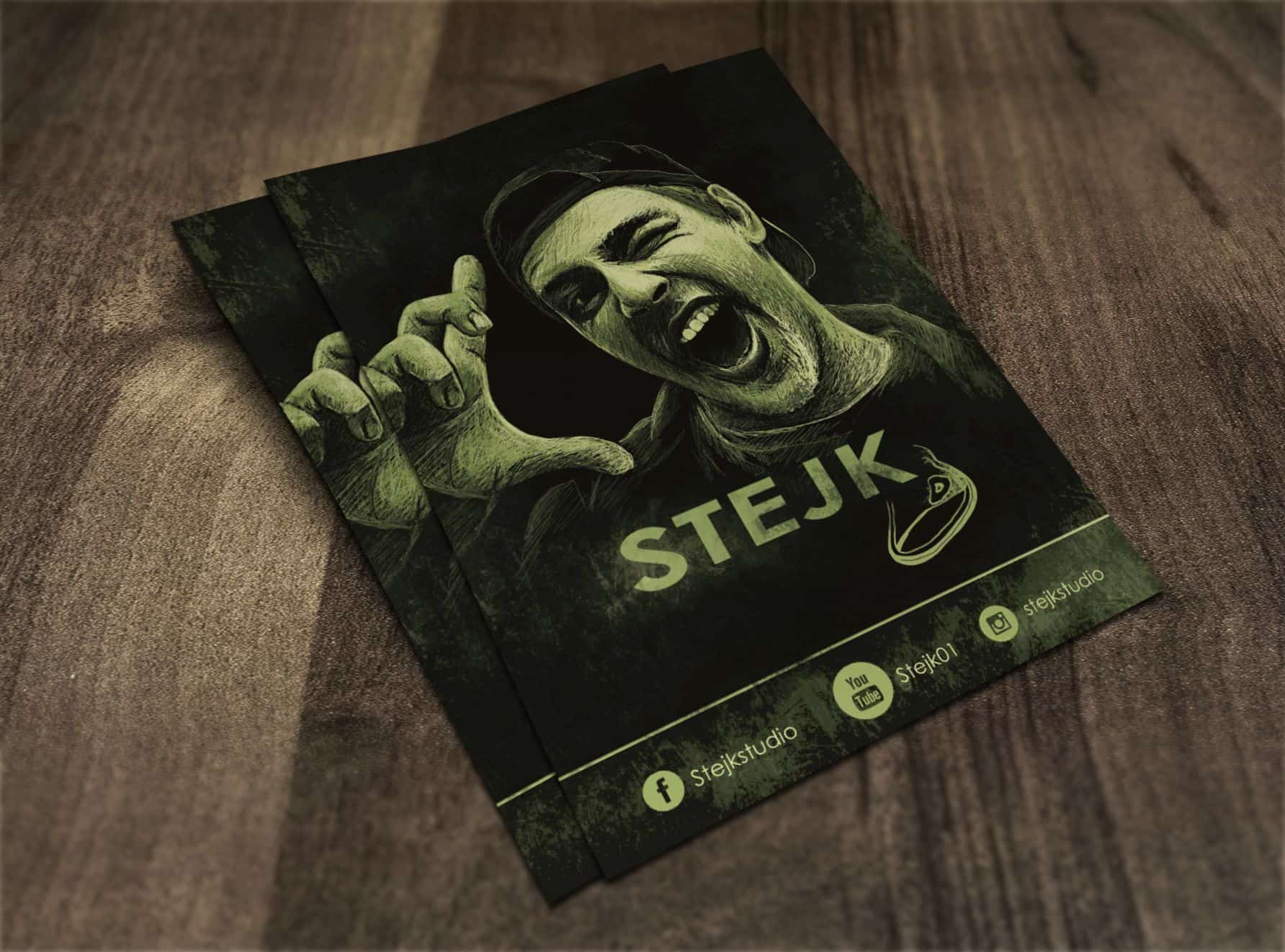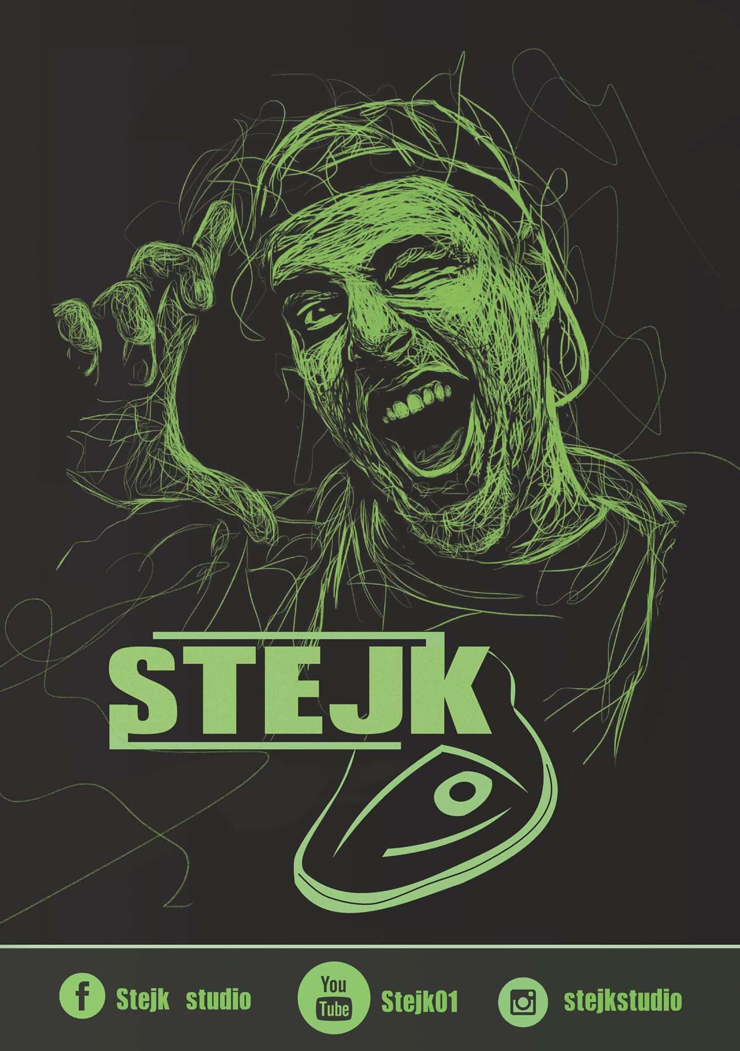 Pravda, toho času jsem neměla nejmenší tušení, co to vlastně youtuber je (někdy mám pocit, že žiju v díře ve zdi). Postupně jsem během rozhovoru zjistila, že bude tento mladý člověk víc než populární. Slovo dalo slovo a já měla najednou před sebou příjemnou zakázku. Stejk mě oslovil s tím, že by chtěl vytvořit podpisový plakát, měla to být digitální ilustrace, a to v jeho oblíbených barvách, aby každý fanoušek mohl dostat i nějakou tu nadílku, kterou si schová na památku. A tak mi přišlo jako nejlepší řešení udělat plakát digitálně. Vytvořila jsem dva návrhy s jeho podobiznou a níže se můžete podívat, jak varianty vypadaly.